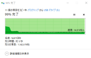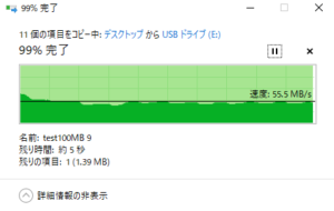 1GBの読み取り速度は113MB/秒出ていました。おおむね記載通りの数値ですね。 書き込み速度は49MB/秒出ていました。書き込み速度は少し物足りないですが。実際にテストデータ1GB×10データを転送してみました。