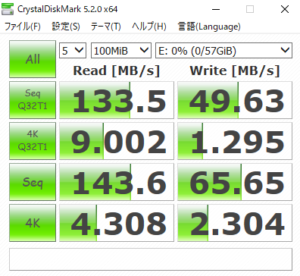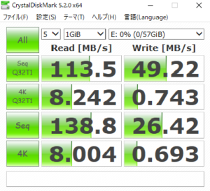では実際に今回購入したSandisk ultra fit USB3.1 Flash Driveどのくらいの速度が出ているかベンチマークを取ってみました。特にメーカーページに記載のない書き込み速度を中心に検証していきたいと思います。