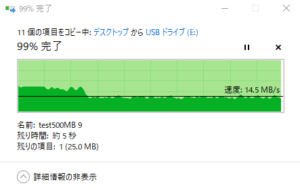 結果としては最大速度60MB/秒が出ましたが、平均すると15MB/秒前後の転送速度になりました。1GB×10データの転送時間は10分40秒でした。大きいファイルの複数データの書き込みは遅くなりますね。