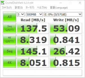 500MBの読み取り速度は137MB/秒出ていました。こちらもおおむね記載通りの数値ですね。 書き込み速度は53MB/秒出ていました。こちらも書き込み速度は少し物足りないですが価格帯も考慮した場合十分だと思います。実際にこちらも同様にテストデータ500MB×10データを転送してみました。